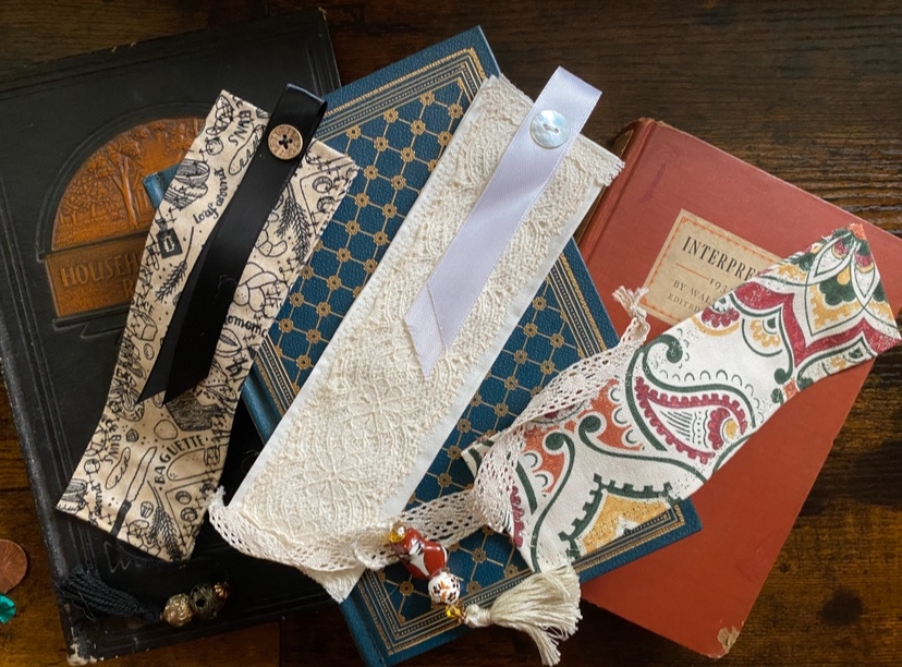 It has been immensely challenging joining three book clubs, but it has been a journey worth taking as a motivator to consume more literature. Since joining the clubs, I was inspired to create some attractive bookmarks for me and the club members. My medium: scrap fabric and whatever materials I had on hand.