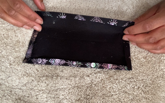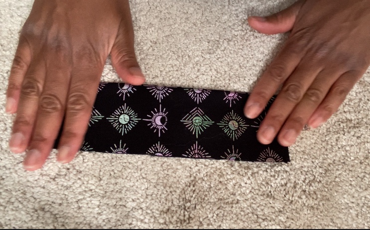 Fold the rectangle in half, ensuring that the right side of the fabric is facing upward, and the folded edges face inward.