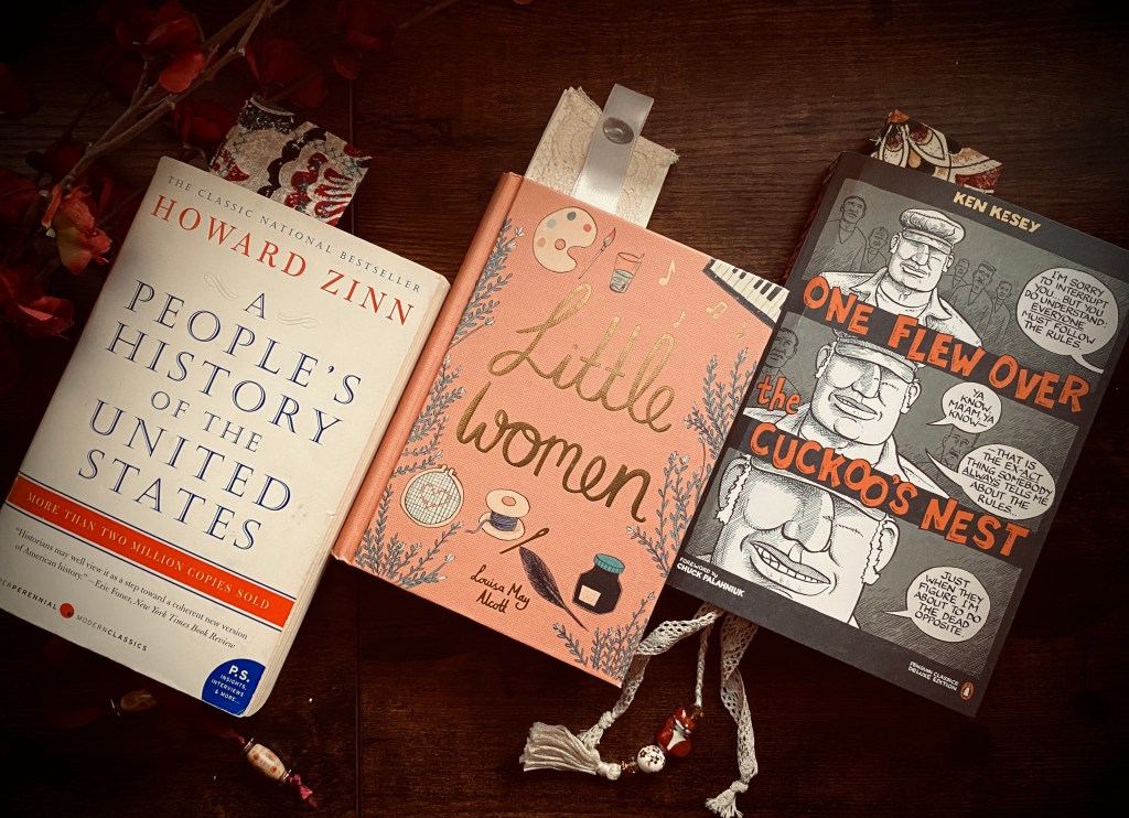 This month, I am working through A People’s History of the United States by Howard Zinn (non-fiction), Little Women by Louisa May Alcott (fiction) and One Flew Over the Cuckoo’s Nest by Ken Kesey (fiction & book club choice).