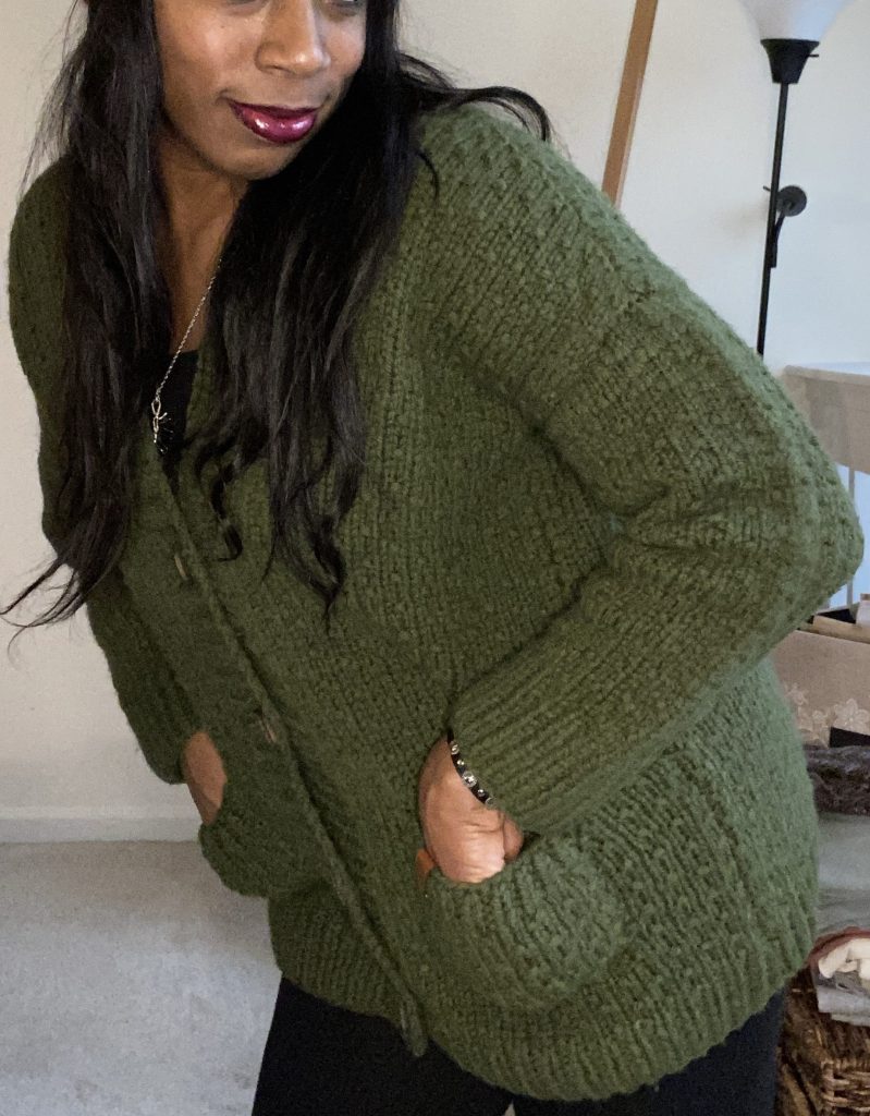 Eventually, I did remake the cardigan using far more suitable yarn, Kelbourne Woolens Germantown Bulky in olive (note, as I write this it is in the process of being discontinued).