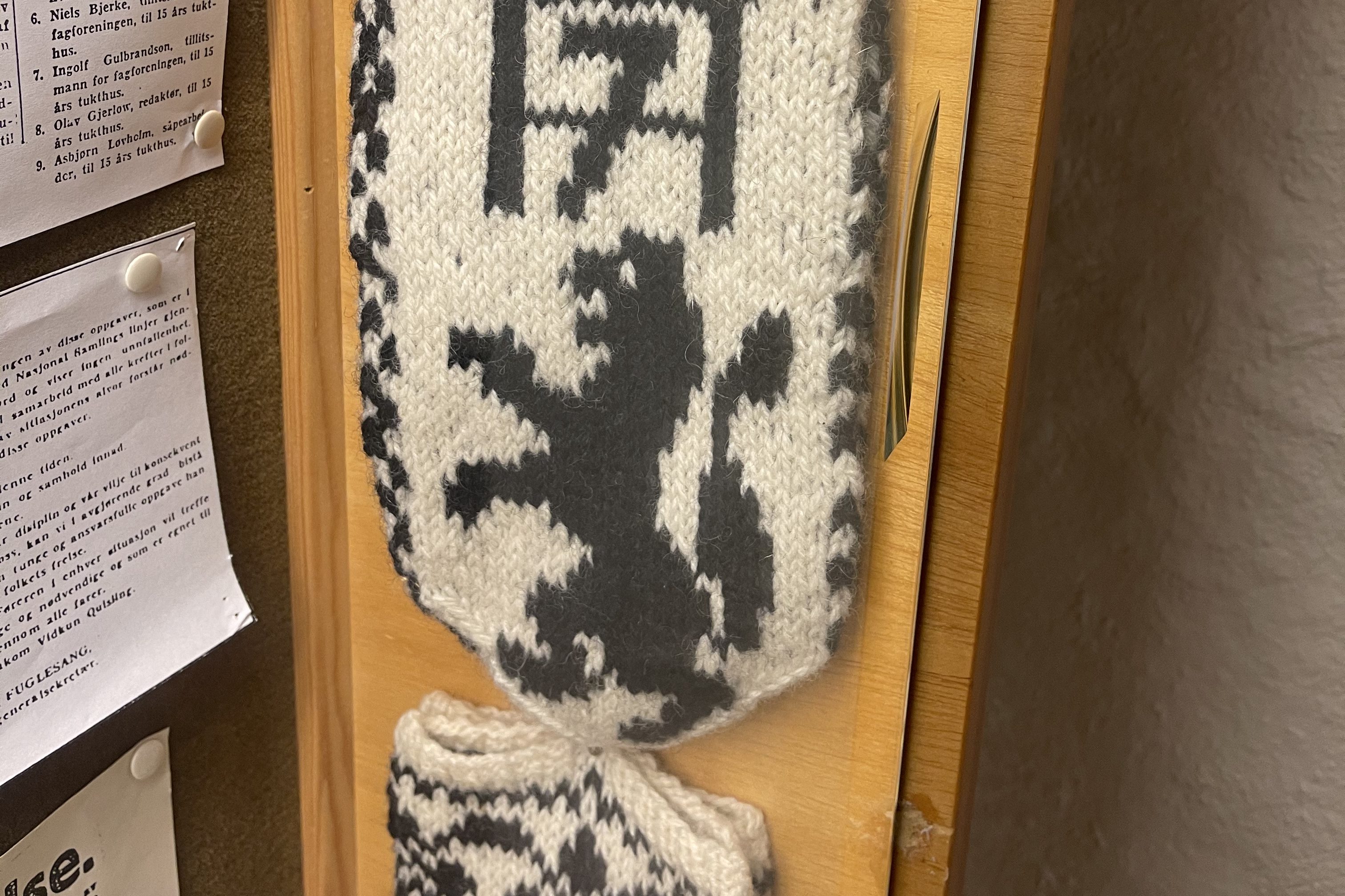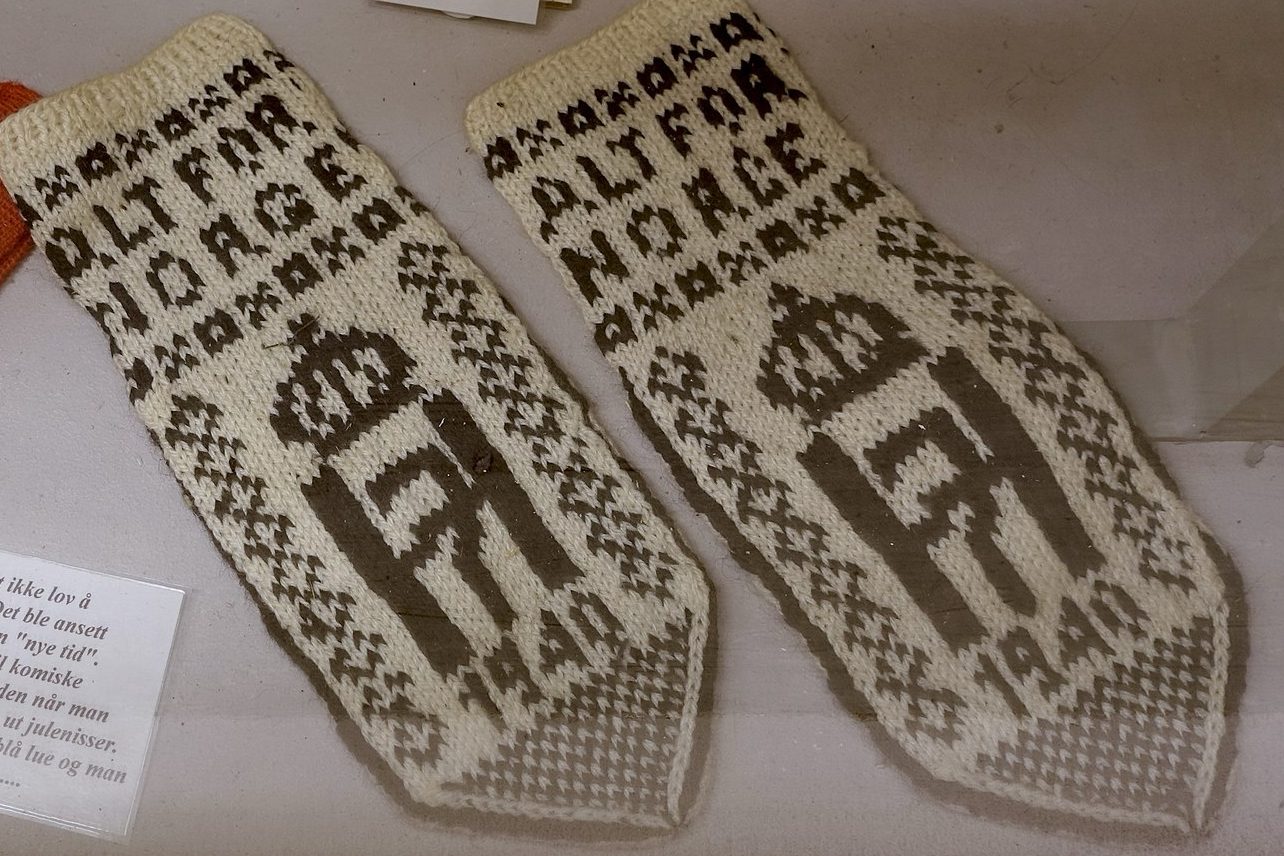 The traditional black and white knitted mittens featured the H7 monogram. This subtle yet open display of defiance aided in national morale by showing solidarity against German occupation. Anyone found with this symbol could be arrested and punished. Despite Nazi propaganda and violent crackdowns, Norwegians continued to wear their symbols.